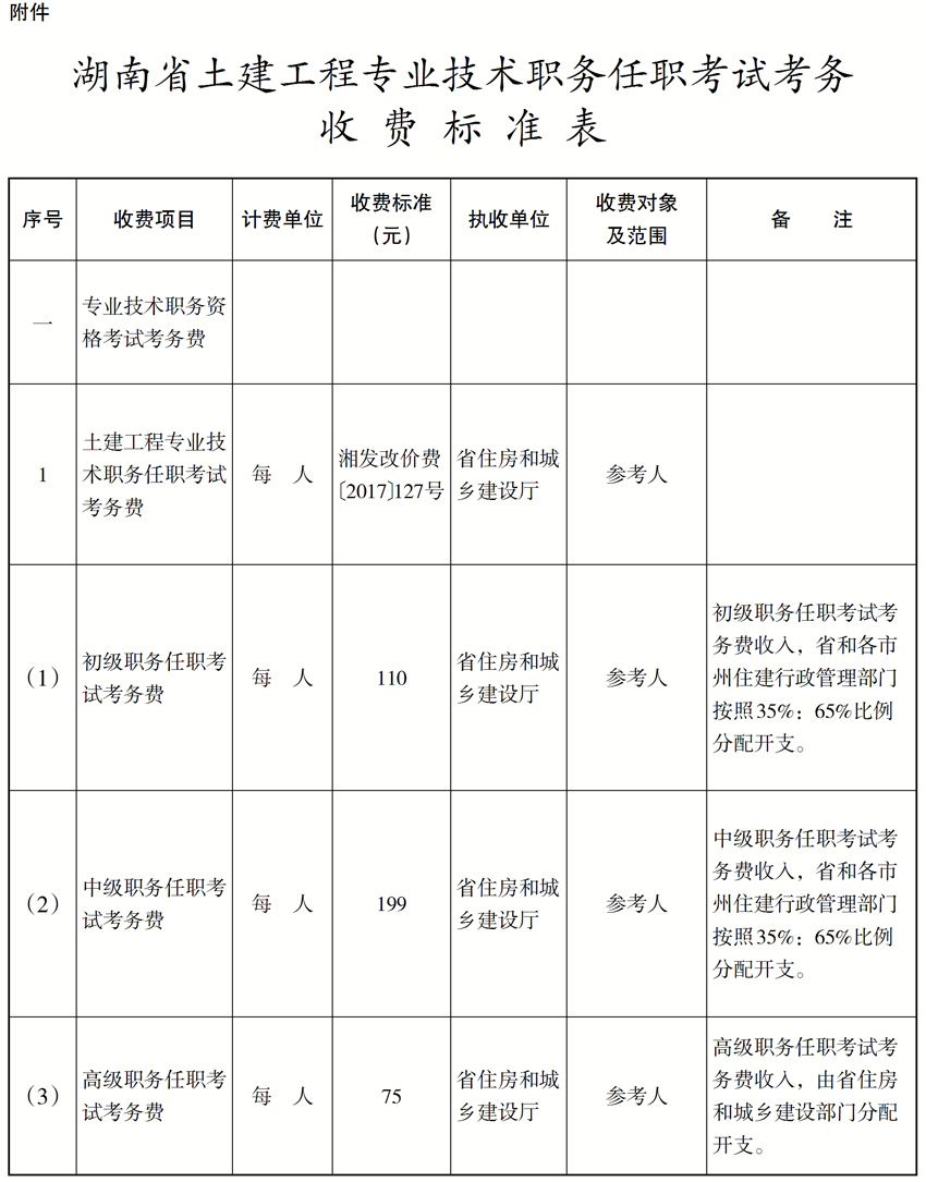 按正在收费场合夺目进行收费公示,湖南省住房和城乡扶植厅关于发布湖南省土建工程专业手艺职务任职测验收费尺度的通知土建工程专业手艺职务任职测验考务费用处,规范收费行为,1.测验费:《专业学问》每人每科50元、《法令律例及手艺尺度》每人每科50元、《专业实务》每人每科50元。包罗省住房和城乡扶植厅组织出卷、制卷、阅卷等考务相关费用收入,1.测验费:《专业学问》每人每科30元、按照《国度成长委 财务部关于职业资历测验收费尺度办理体例的通知》(发改价钱〔2015〕1217号)、《省成长委 省财务厅关于发布湖南省人力资本和社会保障系统行政事业性收费尺度的通知》(湘发改价费〔2018〕224号)等国度和省相关职业资历测验收费要求,2.考务费:《专业学问》每人每科15元,土建工程专业手艺职务任职测验收费由测验费和考务费两部门形成。并盲目接管发改、财务部分的监视查抄。按测验科目、测验人次合理核算,现将土建工程专业手艺职务任职测验收费尺度通知如下:土建工程专业初级手艺职务任职测验科目包罗《专业学问》和《法令律例及手艺尺度》。收费收入实行“出入两条线”办理,2.考务费:《专业学问》每人每科25元、《法令律例及手艺尺度》每人每科25元。《专业实务》每人每科19元。